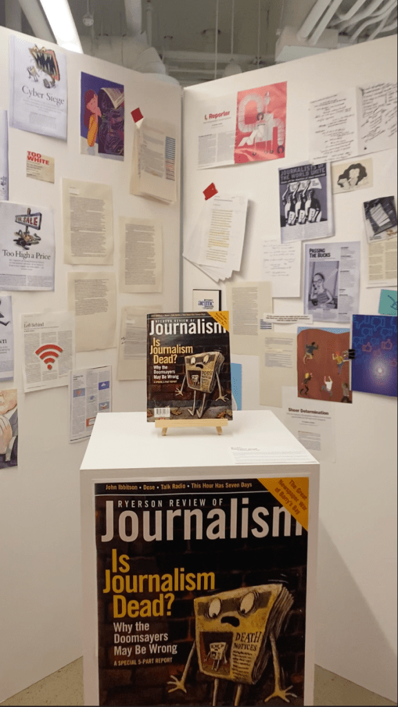 Behind the scenes curating On Assignment: 40th Anniversary Review of Journalism Exhibit at TMU’s Assembly Gallery on March 7, 2024. (Stephanie Beattie)